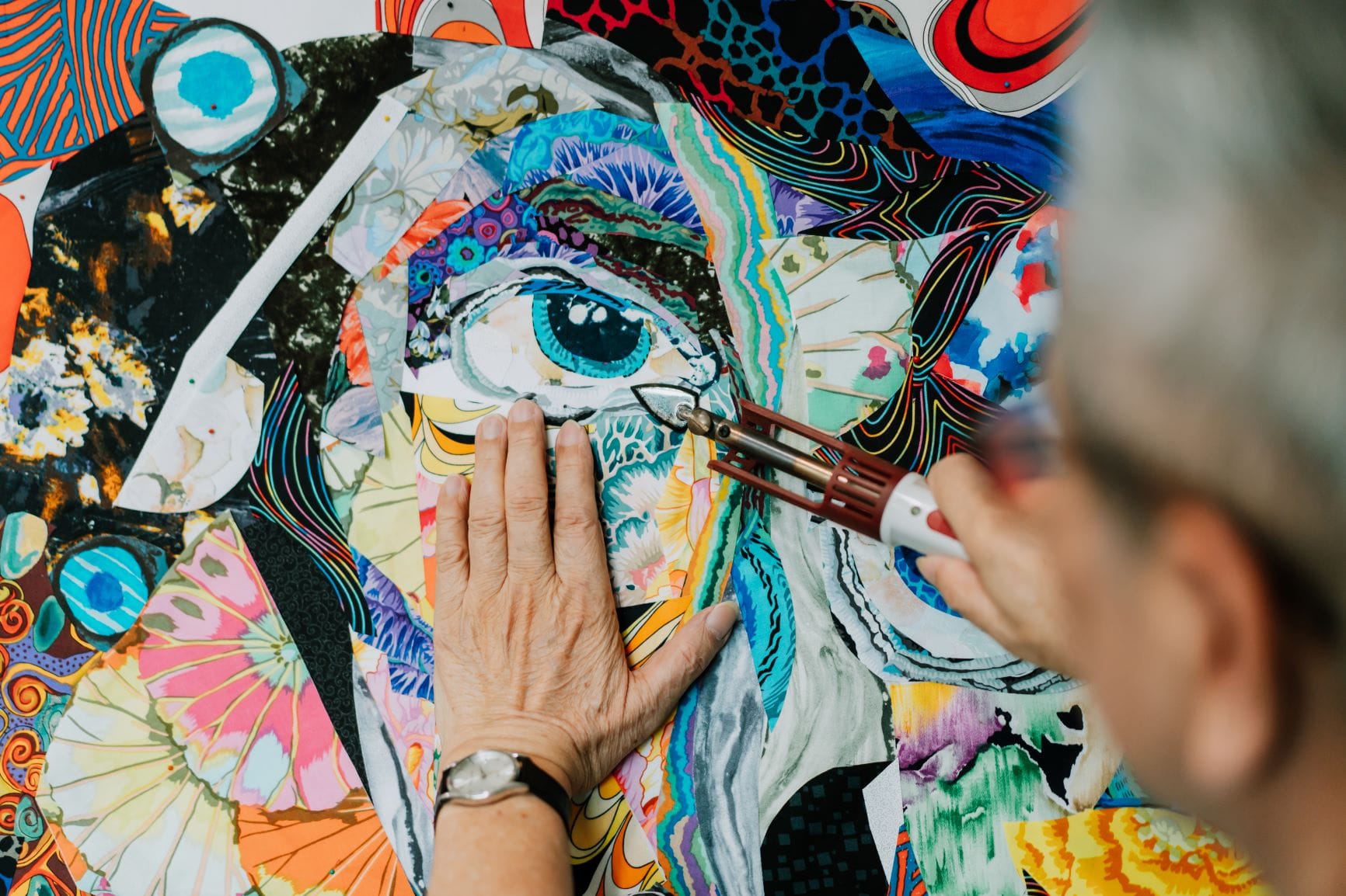 幾千捲的印花布,所有的圖形、色彩與色階、布紋、質地……都記憶在劉棟的腦中,外人看來像是信手拈來的亂貼,其實不然。「其實就是作畫,只是我不用顏料和畫筆,我用的是花布。」劉棟說,「人的眼睛有調色功能,我將黃色與紅色的布塊靠在一起,視覺上就變成了橘色,也就是視覺混色技巧;而我所貼上的每一塊布,就像是畫筆下的一個筆觸。」