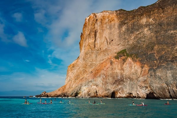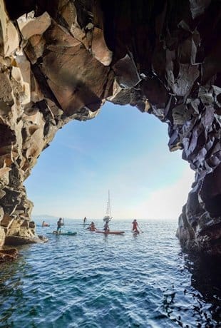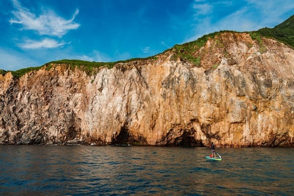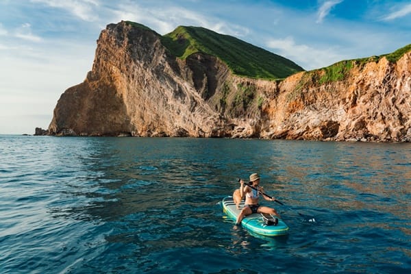 航程約莫一小時,即抵達龜山島海域,從帆船視角看壯闊的龜山島又是另種不同的感受,何況是近身觀賞呢?跟隨著Evan教練矯健與熟練的身手,一個個學員下水展開好玩又有趣的SUP(立式划槳)活動,悠遊於湛藍大海上,即使不會游泳也沒關係,穿上救生衣,或立或坐、要躺皆可輕鬆玩。在這片美麗海洋上划著SUP,心境為之雀躍,經過海蝕洞,划到夢幻浪漫的牛奶海,更是興奮不已,由「海底溫泉」湧生所形成的陰陽海,漸層或深淺藍交織的乳白色海面令人讚嘆大自然奧妙。Evan提醒,近年超夯超火的龜山島SUP活動,越來越受大家喜愛、更為搶手,所以報名要趁早喔!