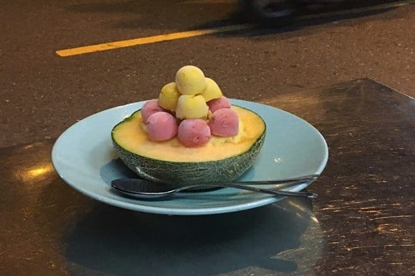 已有八十多年歷史的水果行老攤「泰成水果店」,雖然是老店但創意卻很新穎,老闆利用店內新鮮的哈密瓜作為容器,在不同季節搭配不同水果做成冰品,像是招牌的哈蜜瓜冰,上頭以時令水果製成義式冰淇淋放在店家自製冰沙上,一匙挖下可品嘗到冰的層次口感,相當滿足。