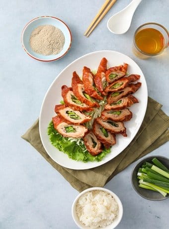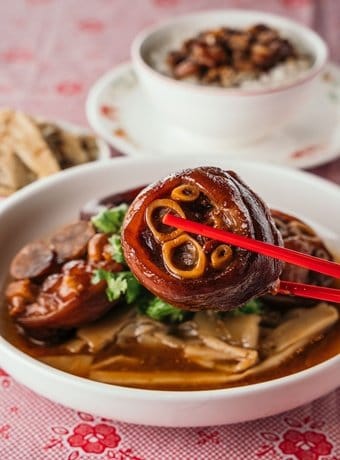 「古早味滷豬腳」特選豬後腳,高溫油炸至皮酥脆,以秘製湯汁滷製多時,香噴噴的豬腳口感Q彈軟嫩不油膩,不由得想起阿嬤的味道。台灣經典菜「脆皮肥腸」,先將肥腸燉滷1.5小時,淋上脆皮醬汁後風乾,鑲入整株香蔥油炸,搭配香蔥胡椒鹽,非常適合下酒。