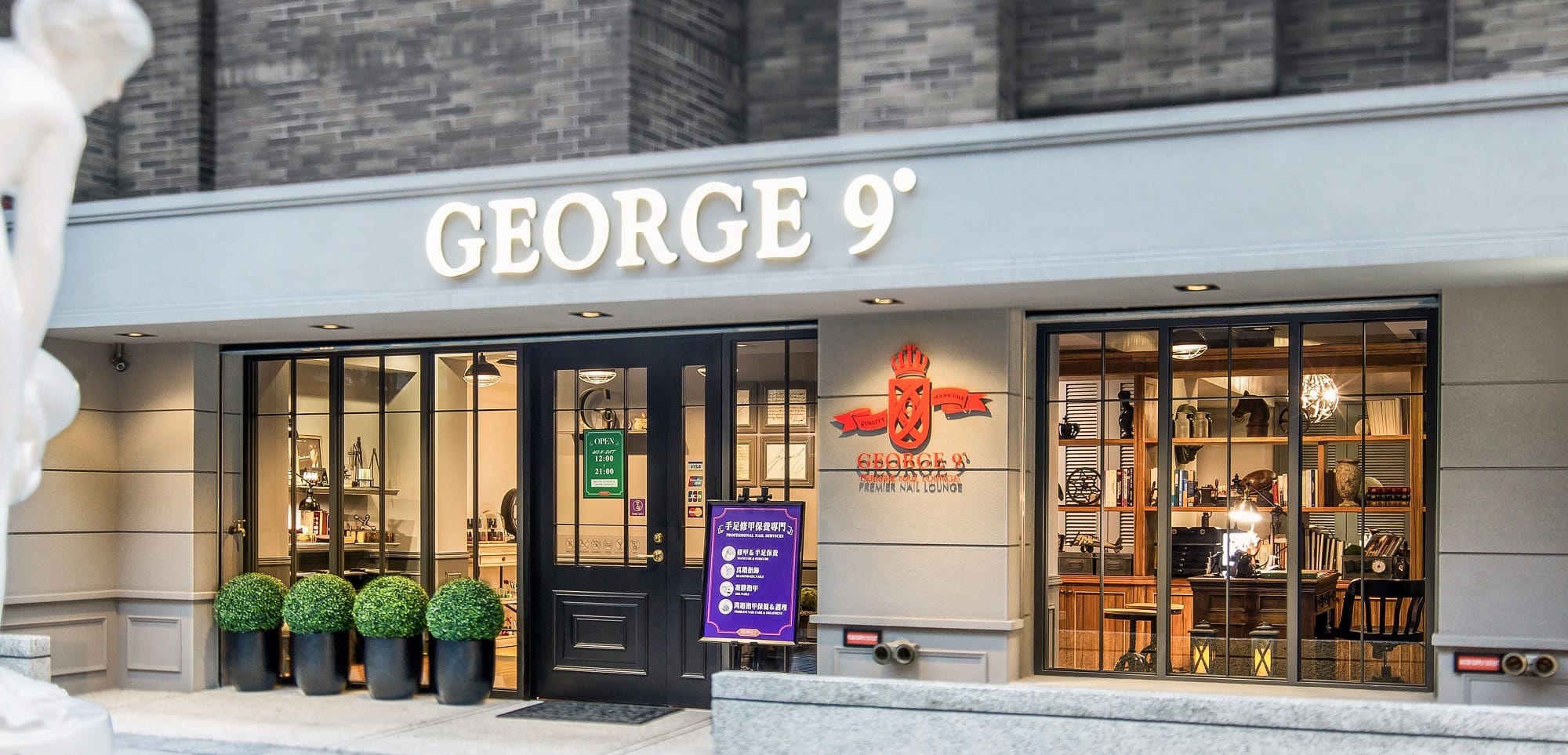 座落在四維路社區內的GEORGE 9,從外觀看起來貌似一間高級的酒吧,也像設計公司,與周邊建築物融為一體的色調,不突兀的招牌,很難令人聯想這是一間專門為手足提供專業服務的店家。