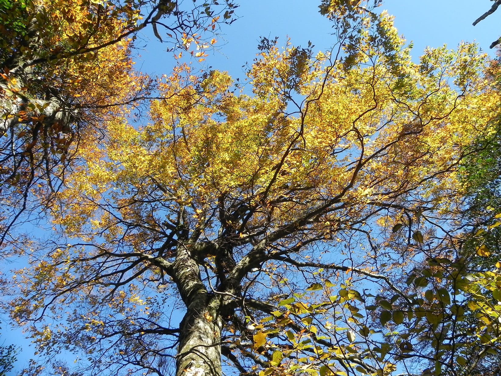 往北得拉曼神木區途中,走完木梯岩稜後,會來到1.6K叉路口,牌子寫著往右會抵達北得拉曼神木群,但繼續往前走就會到打內鳥嘴山跟神木群,不久後地上開始有黃色落葉,紛紛出現開著黃色樹葉的山毛櫸,途中還會經過老山毛櫸樹的壯碩與神氣,而下山後可以順路經過北得拉曼神木群,一石二鳥的觀賞這聖山裡的神木天地。