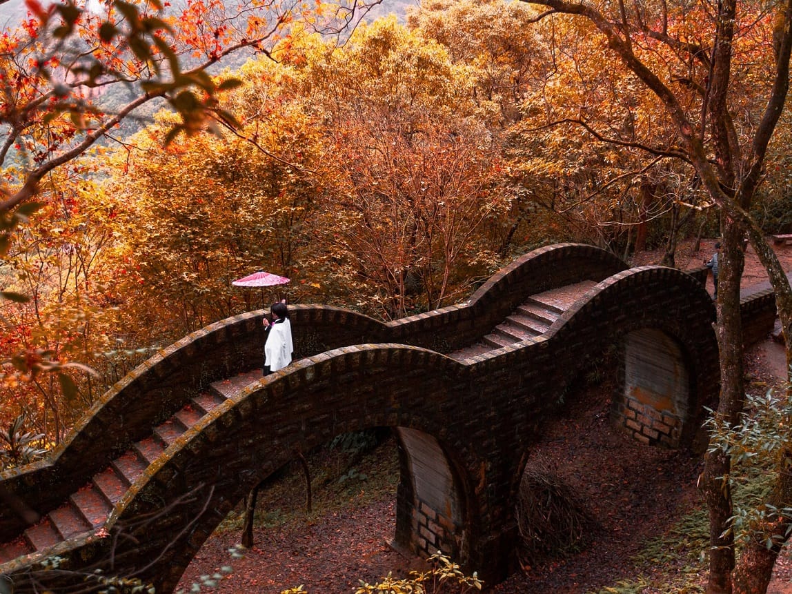 重頭戲為廟宇後院的雙拱橋,被紅楓葉圍繞的橋,不管是從橋下或是一旁的山坡上,都能捕捉到如京都般的古城氛圍,而在這層林盡染的秋季,也是許多人選擇拍婚紗的景點,站在橋的中間新娘的頭紗向後飄落,烘托出大自然的瑰麗。接近傍晚時,夕陽在紅楓葉上套上濾鏡,帶點光影的楓葉像是另類的燈火般燦爛無比,又好比像是栩栩如生的火焰,五彩斑斕的紅楓葉像是入秋的一杯熱茶,在每個人的心中留下難以忘懷的印記。