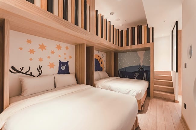親子館為擁有36間超大坪數的主題式房型,坪數達28∼36坪,包含櫻花仙子、山洞火車、蔚藍山海、森林精靈、神木伯伯、麋鹿樂園等六種房型,一開門就是驚喜畫面,好萌好可愛,讓人忍不住拍不停、忙著打卡。而寬敞的獨立大浴池,更是度假的絕對享受。親子館也是孩子的汽車旅館與賽車場,每間房間皆附有兒童專屬車庫、電動小車,於專屬跑道行駛,夜晚也可尬車,小朋友玩得不亦樂乎!