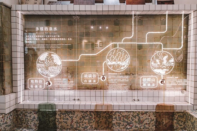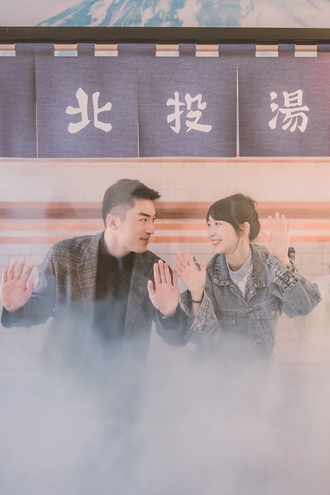 將北投溪、地熱谷、硫磺谷等畫面投影在大螢幕中,民眾進入小浴池,螢幕上便會出現自己與各景點的互動情景,模擬在北投野溪泡湯的模樣,要拍出水淋頭頂的搞笑照片,或是煙霧瀰漫的夢幻打卡美照都不是問題,鍾兆佳笑說:「地熱谷屬於青磺泉,高達98度,要泡湯還真是不可能的任務。」另外還有硫磺谷的白磺泉、紗帽山的鐵磺泉,這些都是北投溫泉水的源頭,運用互動裝置吸引大家目光的同時,也達到傳遞北投溫泉珍寶的效果。