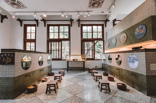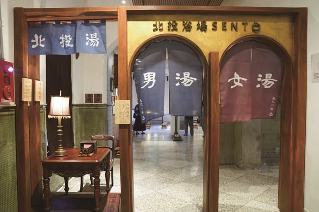 從男湯女湯的字號簾開始,已充滿濃濃日式風情,彷彿坐上時光機穿越時空,入口處還有入浴料金的牌子,「日治時期,泡湯是具特殊身分及有錢人才能擁有的高級享受,因此公共浴場是將溫泉變普及化的轉捩點。」鍾兆佳解釋,當年最貴的佳山旅館(現今的北投文物館)要價6塊,相當於120碗麵的價錢,所費不貲,而北投溫泉旅館裡的公共大浴場入場費只要20錢,等於4碗麵費用,就可以泡湯並在塌塌米上休息,但若只泡湯不休息,更只要5錢,「用麵價來看,120比1,就能知道公共大浴場讓泡湯文化遍及北投地區的重要性。」