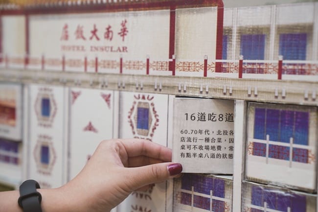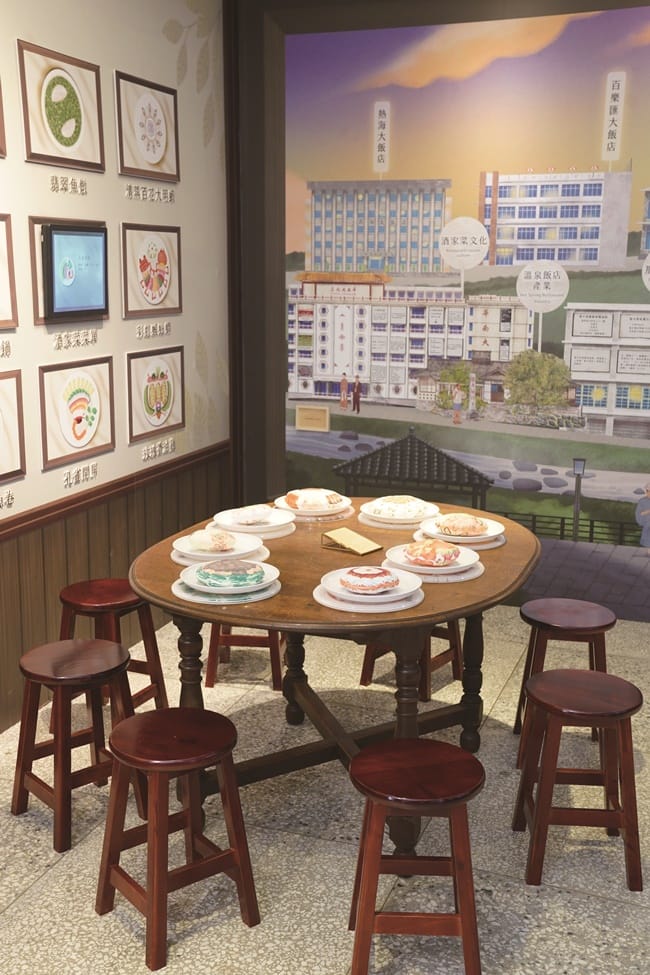 「歡迎來到北投溫泉大飯店,要先check in喔!」二樓展示空間的入口處設置了AR互動裝置,增添臨場感。更邀請繪圖師以相對應的地理位置,繪製了整面牆的北投地區圖,模擬當時溫泉鄉飯店林立的榮景,甚至帶動電影產業在此蓬勃發展,發展出那卡西、侍應生及酒家菜文化。揉合了日式料理精緻巧思,與台菜澎派大氣的精髓,北投酒家菜自成一格,講究程度不僅止於食材用料、細膩刀工、烹飪技巧、擺盤美感,每道菜背後更蘊含著不同意義,還有北投特有的「點半桌」文化。為了再現北投酒家菜風情,特別尋找老師傅還原菜色樣貌,魷魚螺肉蒜火鍋、蜂蜜路易士排骨…等經典菜色,以繪畫方式澎湃上桌。