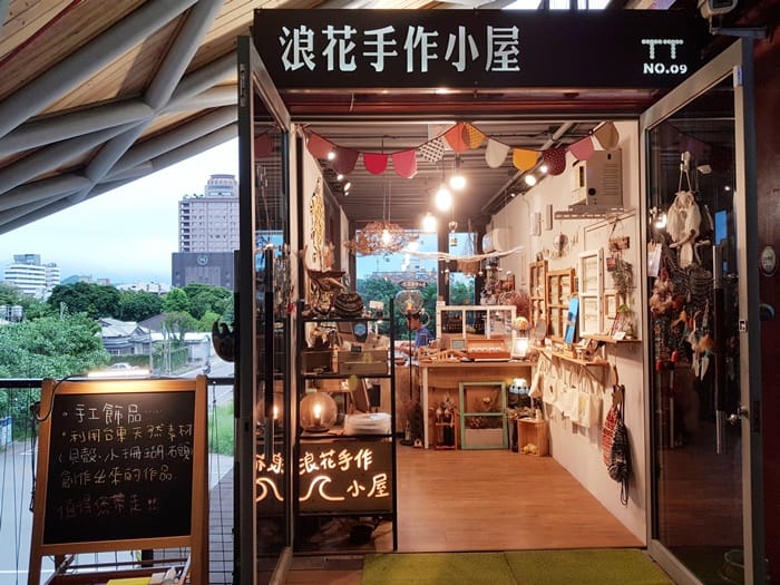 以貝殼、海玻璃、永生花等做成的耳環,可愛小巧、個個獨特,讓人好心動。人氣商「浪花手作小屋」是由漂亮的小魚和老公俊韋共同經營創作,在波浪屋進駐3年了,店非常受觀光客的喜愛。店內展示架採用舊式木製窗框、漁網、漂流木,很有台東特色的海味。主要販售手作的鋁線飾品、衝浪繩、創意小植栽、手作包包、手染布料、創意燈組等。