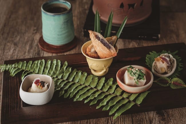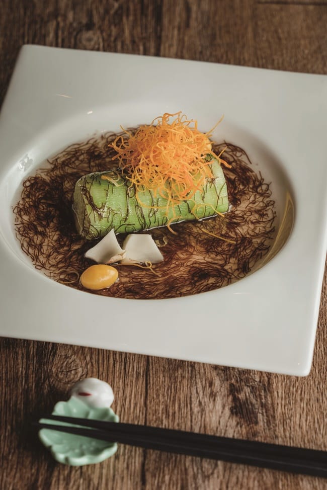 茹素者也不用擔心,少帥禪園根據張學良飲食菜譜,規劃禪鮮素食套餐。不若坊間素食料理那般無味無趣,運用食材本身的色彩及特性,將餐飲美學發揮極致,從前菜的紫山藥麻糬燒及香菇素火腿包成的福袋,便可知餐飲團隊的用心。山居好野味更是一絕,冬瓜以昆布醬汁燉煮,再將絲瓜薄切如紙,包裹冬瓜後蒸熟,最後淋上絲滑髮菜芡汁,佐以金黃地瓜絲、銀杏、百合,綿密冬瓜、脆口絲瓜,多種不同食感在口中交織出完美的協奏曲,口感豐富,層層驚喜,清甜回甘風味讓人意猶未盡。