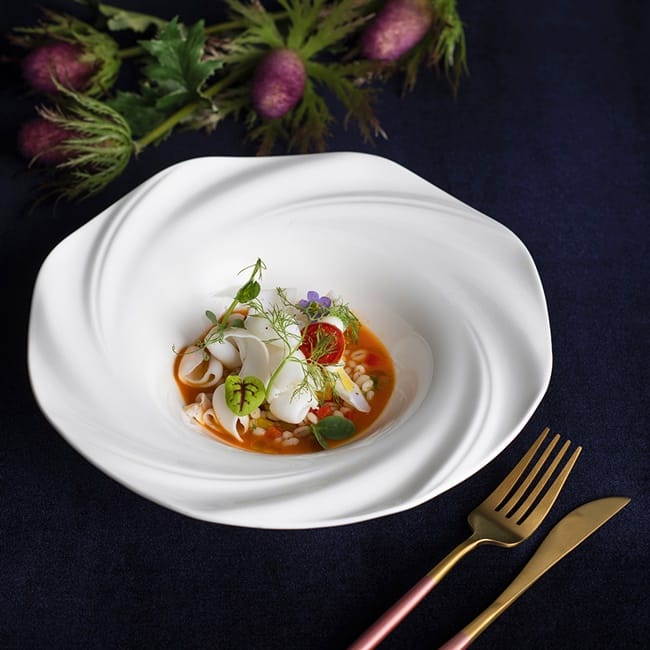 將墨魚以長條狀切法,並以海鮮高湯小心汆燙些許時間,再淋上與海鮮味道百搭的番茄冷湯作為佐醬,以提升料理清爽感,主廚巧思將義大利國旗三個顏色的元素創意呈現於盤中,同時搭配季節蔬菜及薏仁,最後將烤番茄辦及茴香點綴其中。