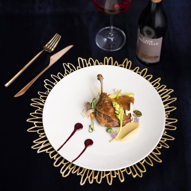 此道料理以「油封(Confit)」作為主要料理手法,亦是法式經典佳餚代表之一,其手法起源自南法,為了將其鴨肉的油質固態化以方便保存,將鴨腿先泡在鴨油油脂裡約12小時,並以低溫小火慢煮的方式,將鴨腿煮至軟嫩入味後再將鴨腿以明火烤箱烤5至10分鐘,外皮酥脆而肉質柔嫩,配菜則是營養價值極高且風味融合紅蘿蔔與芹菜的防風草泥以及醃製過的白花椰菜,主廚再淋上酸甜風味的黑醋栗醬提味,增加油封鴨腿更多層次的口感。