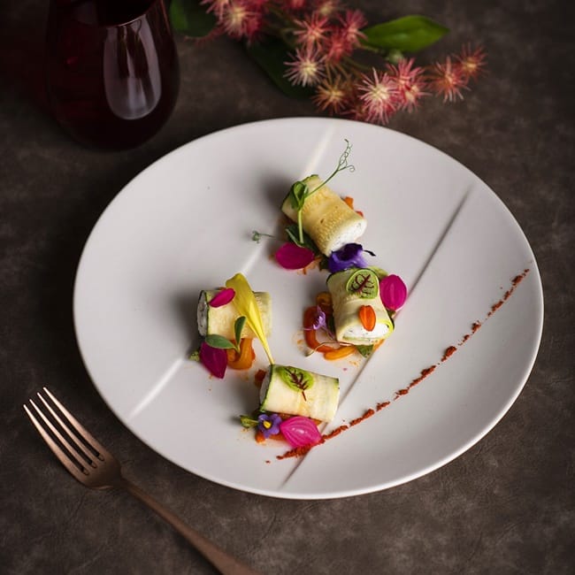 主廚將義大利麵捲(Cannelloni)的概念帶入前菜,以台灣櫛瓜代替麵皮,將櫛瓜捲入松露及瑞可達起司,瑞可達起司綿密口感帶有細微的顆粒感,為清爽的櫛瓜增添不一樣的層次風味,並將燉煮一小時的甜椒、芝麻葉及珍珠洋蔥作為點綴,搭配櫛瓜與起司一起享用,豐富口感讓人回味無窮!