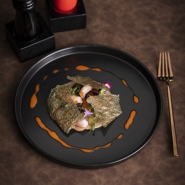 這道充滿海洋風味的前菜是選用日本的青魽魚,因魚肉有豐富的脂肪,卻不像鮪魚有較濃厚的魚鮮味,是極清新淡雅的一款魚肉,主廚將其醃漬兩小時後切成薄片,搭配日本生甜蝦及鮭魚卵,並以彩色海藻作為料理配色,並襯上烘烤過的西谷米海苔片,淋上柚子油醋,再將甜蝦腦加入鮮奶油製成醬汁,在上菜時為客人淋上以-193度的液態氮的急凍海膽碎,氤氳迷濛的乾冰特效讓人驚喜,各式鮮甜海滋味迴盪唇齒間,清新開胃彷彿沉浸在浩瀚海洋中。