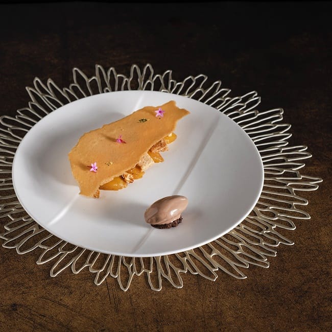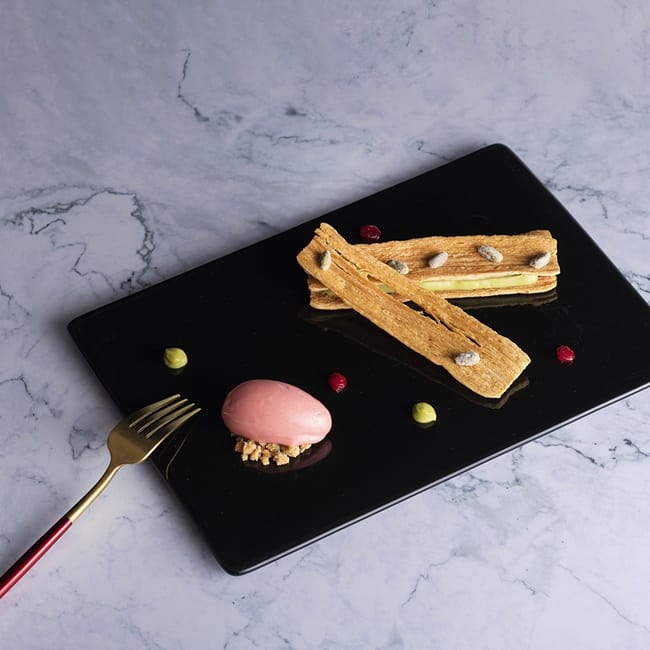 吃完主廚精心準備的山珍海味,再來是另一個胃期待的甜點登場!新菜單的甜點也極具巧思,例如經典的千層酥(mille feuille)也在甜點主廚胡孟洋(Yann Roumanille) 把所謂的千層改為雙層,在雙層千層酥麵皮中用開心果奶油和草莓果凍夾心,酸酸甜甜滋味交織在舌尖,讓人回味無窮,點綴旁邊的是浪漫粉色的草莓雪酪,無論視覺味覺都多了層次!