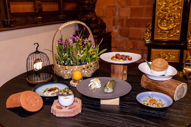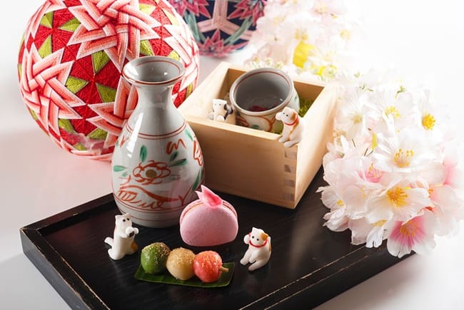 搭配日本主題,The Lounge大廳酒吧特別設計2款應景特調,每杯單點售價300元+10%。「櫻花下的喵」選用木製清酒盒再搭配杯組,打造出櫻花樹下的庭院場景,捧著飯糰的翻糖貓咪正在愜意地野餐,一旁的清酒壺中是具有櫻花風味的奶茶,杯子內有一朵鹽漬櫻花,倒入奶茶後品嚐,鹹甜風味完美結合。「梅子蘇蘇」則以日本常見的紫蘇作為延伸設計,入口先品嚐到梅子果醋的酸味,中段會感受到冷泡綠茶及些許的氣泡感,尾段拉出紫蘇葉的香氣,為最適合搭配下午茶的清爽飲品。