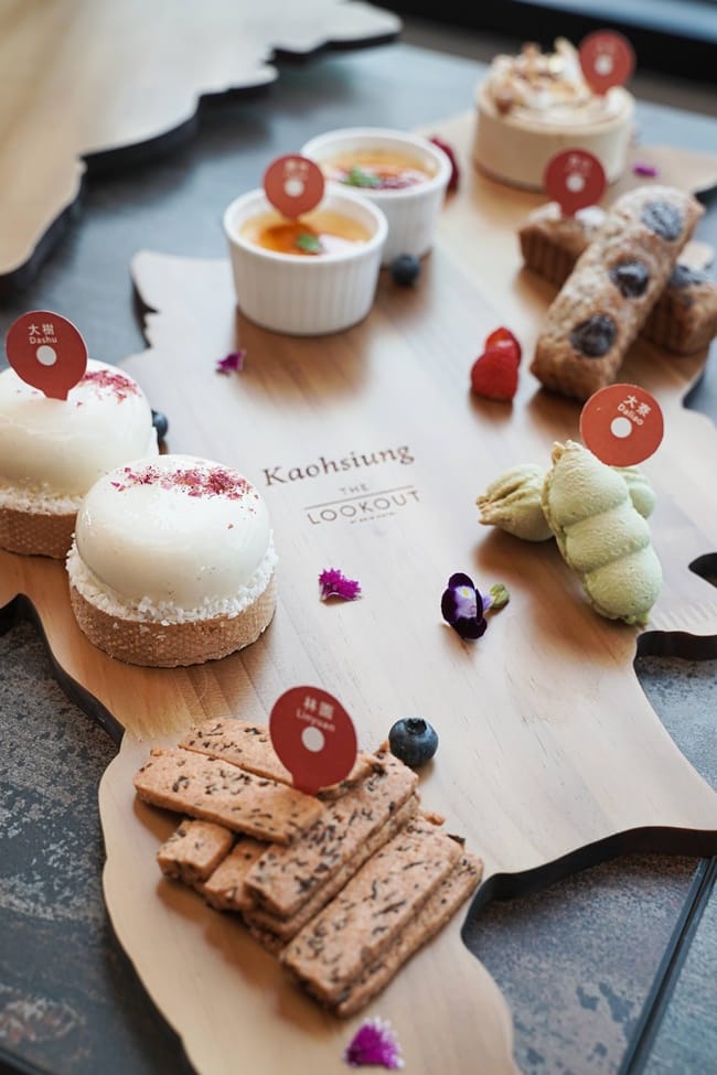 比歐緻居所屬的眺吧餐酒館,是由專業的摘星廚藝總監調理,李伊梵也希望能以分子料理方式製作甜品,讓食物有不同想像味道,就像這次用「大寮」的毛豆製作馬卡龍,顛覆一般毛豆是下酒菜印象,躍升為法式甜品;「林園」的洋蔥葉做成餅乾,吃得到些微辛辣味;「路竹」的玉米結合椰子成了烤布蕾;也將「大樹」的盛產鳳梨製成白乳酪鳳梨塔,在濃郁乳酪中加入鳳梨的酸甜,增加口感層次。這些尋常的食材稍微重新排列組合一下,呈現出不一樣甜品味道,也象徵著高雄在地文化的多元和創意。其實這也是甜點主廚李伊梵的期望:「高雄真的很好,很多很棒的在地食材,希望能用這樣的方式讓大家多了解一點高雄,也希望呈現出食物最美好的時候。」