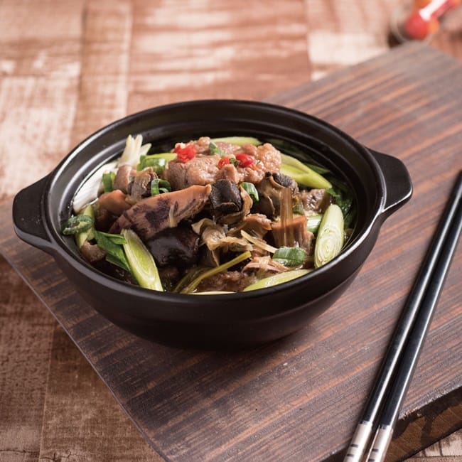 除了喝湯,民眾也喜歡來上一杯小酒熱熱身子,必定要搭配「魷魚螺肉蒜」,為台式經典酒家菜,特選天然野生海螺和阿根廷乾魷魚,搭配蒜苗、排骨酥、芹菜和香菇,以小火慢燉出甘甜氣味,即使飽到翻肚,還是能一口接一口吃到碗盤見底。
