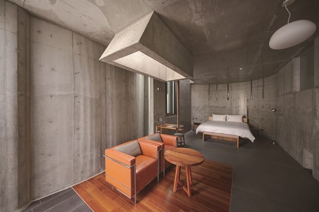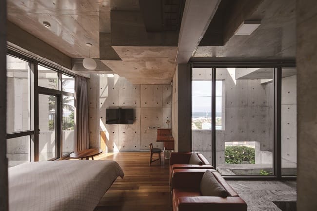 發哥表示「在設計之前,曾參加建築師的日本見學之行,參觀安藤忠雄、伊東豊雄的作品很感動,喜愛日本清水模建築更細膩的呈現,因此我親自發包監工,注意細節,雖然過程很辛苦,工班叫苦連天,但看到成品,不僅是圓夢了,也當作是藝術品的收藏,表達對這裡環境的善意,一切都很值得」。「後灣發宅」開業三年多,早已成為小漁村地標建物,著名的網美民宿,建築相關業者慕名而來,光看建物外觀每個立面截然不同,就讓人駐足欣賞許久和拍照。推開紅銅大門蜿蜒而入,接待大廳清水模灰階色牆面的自然紋理,搭配天然原生木家具,極簡時尚風格,沒有過多的修飾。整體場域寬敞自在,不易受他人打擾,以大理石背面鋪陳的地板觸感舒適,而隨著光影的流動,5間客房的空間表情也跟著變化。