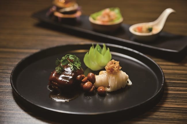 張學良每天必吃的蝦料理,年菜套餐選用肉質肥厚大明蝦,底下墊著白蘿蔔,以清蒸方式釋放白蘿蔔的柔嫩甘美,更飽滿吸附蝦湯精華,每一口都是滿足。黃金鯧則切塊酥炸,鎖住肉汁及清甜,吃出外表酥脆,肉質柔嫩細緻的驚喜口感,連魚鰭魚尾都如同餅乾般爽脆。象徵長壽吉祥的花生豬腳麵線,以醬油炒冰糖上色後滷製,豬腳透嫩入味,展現臺灣豬本身Q彈肉質,尤其是豬皮更是滷到連牙口不好的長輩也能輕易食用,麵線則拌入麻油、蒜酥,耗時費工完成這道年節的必備佳餚,將傳統台式風味完美呈現,勾勒出記憶中的滋味,過年不可或缺的長年菜,更緊扣健康養生主軸,用蛋白勾芡,濃稠順口,清爽低熱量,每一道都是極度考驗主廚的功夫菜。