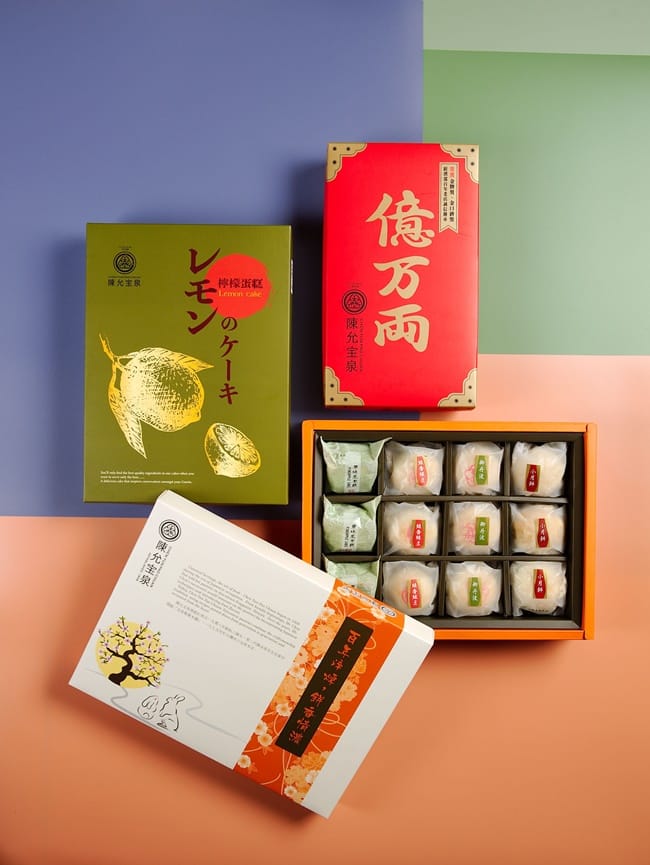 「綠香綠豆」,嚴選蜜漬綠豆的傳統風味,特選台南綠豆,特殊工法製成的蜜漬綠豆及綿密豆沙,用完美比例混合而成的內餡,在紐西蘭進口奶油所做的餅皮之下,充滿著獨特清新綠豆香,讓傳統美味變成一種極致享受。「原味鳳梨酥」,充滿著烤焙香氣的酥鬆外皮完整包覆,採用新鮮帶有酸甜纖果的鳳梨製作成溫柔滑順的香甜內餡,保留著最自然的田野自然芬芳,榮獲台中市政府認證「天下第一酥」第一名「最佳元氣獎」,實至名歸!另一款年節伴手禮推薦「億萬兩」禮盒,紅色包裝與討喜名字,可自行搭配,像是御丹波、小月餅、桃山香柚、蛋黃酥的小四喜組合深受長輩們的喜愛。「桃山香柚」,是日本明治時代於京都盛行的燒菓子,外層是用特殊的桃山皮,吃起來和一般台式的傳統糕餅不同,餅皮口感鬆軟,佐上新鮮的日本香柚,內餡是日本高級的白鳳豆沙,唇齒間散發出獨樹一格的淡淡清新果香,如置身京都品茶之優雅風味。與小月餅一樣同為「陳允宝泉」第三代創始研發的代表作「蛋黃酥」,榮獲食品金牌獎與台灣百大伴手禮殊榮,特製的金黃亮麗,多層次的酥皮,鬆軟綿密的口感,以精心熬煮的紅豆餡,襯托出傳統手作,半顆的鹹蛋黃特殊鹹香風味,鹹甜交織風韻絕佳,是流行40年不曾改變的好味道,愛不釋手。