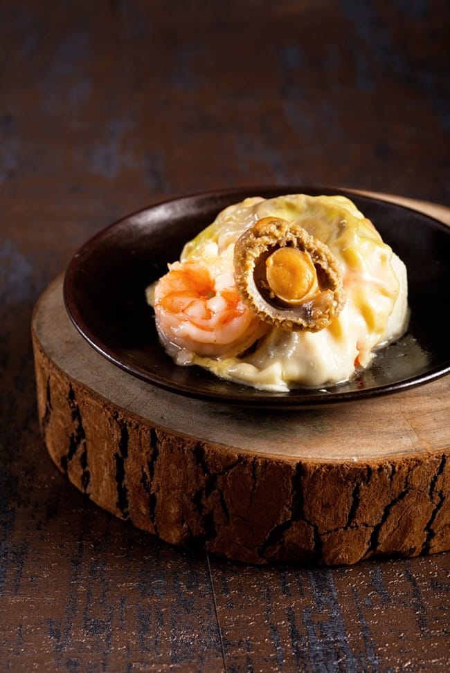 粵亮廣式料理也同時推出超豪華港點「鮑魚灌湯包」,每盅320元+10%,外層皮薄又有勁道,剝開外皮後,熱騰騰的鮮美湯汁立刻流淌而出,整顆鮑魚、完整大蝦頂級內餡現身,先淺嚐濃郁但不膩口的湯汁,再細細品嚐飽滿的內餡,鹹甜香醇的滋味立刻收服老饕的心。