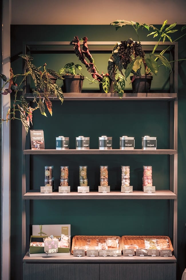 「Orchard Taipei」店內商品種類繁多,包括餅乾、全素食餅乾、軟糖、常溫糕點、蛋糕捲、經典冷藏蛋糕、常溫燒果子、果醬等應有盡有,呼應店名,將在地或進口新鮮水果食材融入。喜歡各式甜點,在這裡幾乎都可以買到,尤其是招牌法式水果軟糖,多於其它店家只有3、4種,「Orchard Taipei」研發多達15種口味,特選法國進口的果泥熬煮,純手工製成,且做工繁雜,Q彈果香甜蜜滋味,一口咬下立即愛上,真的有種法式初戀感覺,繽紛鮮明的多漾色彩相當討喜。去年新推出的夾心餅亦大受歡迎,好像馬卡龍一樣充滿多彩的色系,嚴選法國伊斯尼奶油、台灣在地果乾、日本玄米抹茶、石安牧場雞蛋,酥鬆的餅乾與奶油完美結合,豐富層次感受,有酒釀葡萄、紫蘇西紅柿、抹茶白柚、草莓乳酪等多種口味,清爽不膩的內餡,微甜微酸的果香,每一口都銷魂,讓人停不下手。店內也可以悠閒地坐下來享用各式甜點搭配特調飲品,再來慢慢選購禮盒,包裝充滿文青風質感,還可以選擇自己所喜歡的商品自由組合,非常貼心,藉由精挑的禮盒,為您傳遞滿心的真摯祝福。