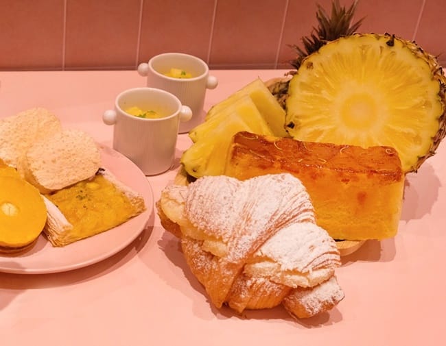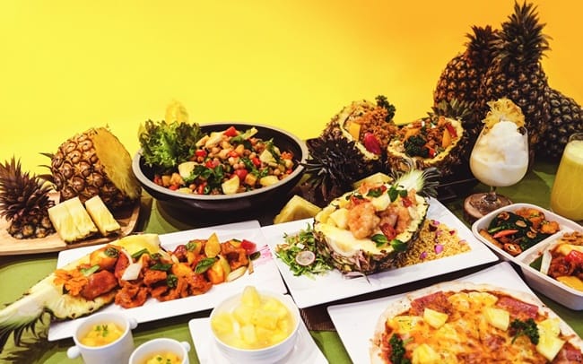 六福旅遊集團結合旗下飯店、餐飲、烘焙、遊樂園各單位,設計多達20種以上的鳳梨商品,台北六福萬怡酒店旗下敘日全日餐廳將於自助餐檯供應鳳梨風味料理,包含熱湯、沙拉、鳳梨炒飯、燒烤豬肋排佐鳳梨燒烤醬、披薩、新鮮果汁等輪番上陣,粵亮廣式料理則是鳳梨料理新上菜,包含「紅咖哩鳳梨蝦球炒飯」、「鳳梨咕咾肉」、「馬告鳳梨苦瓜雞」、甜品「鮮鳳梨海燕窩」等,另外也推出便當「鳳梨咕咾肉」、「鳳梨咕咾燒雞球」,可來電訂購,或至南港車站購買,上班族也能美味享受。關西六福莊也吃得到各式鳳梨料理,好望角餐廳更結合在地風味推出「客家香蔥鳳梨排骨米板」,Phoenix餐廳也於晚間自助餐檯上無限供應涼拌木耳鳳梨沙拉、甜醬鳳梨雞腿排、新鮮水果等。另外,一禮烘焙也新設計鳳梨系列商品,囊括多款手工點心、蛋糕、麵包等,要讓鳳梨控們大飽口福。