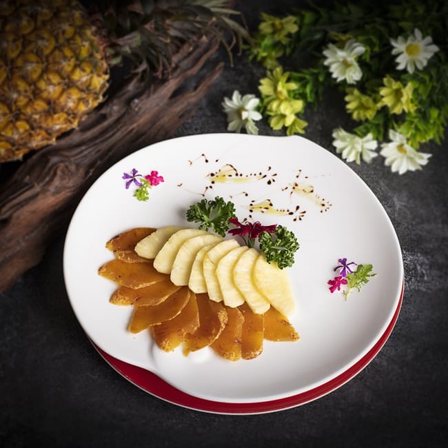 香格里拉台南遠東國際大飯店「醉月樓」許忠賢主廚力挺地方好農,以行動支持選用酸甜適中、且果肉飽滿多汁的台南關廟鳳梨,推出鳳梨苦瓜古早雞湯、鳳梨醋溜文昌雞、鳳梨金針燒蘆花雞、關廟鳳梨蝦球、鳳香外婆紅燒肉、薑片鳳梨蒸鮮魚、鳳梨甜椒炒牛肉、夏威夷鳳梨炒飯,每道單點360元至780元起可供選擇,另有特調鳳梨冰茶每杯99元;「遠東CAFÉ」自助餐廳則於每日午、晚餐時段,鳳梨中西料理輪替上菜,每位850元至990元起 (以上價格均須外加一成服務費);而「品香坊」更有經典土鳳梨酥與綜合鳳梨禮盒,每盒599元至699元,千萬不要錯過。