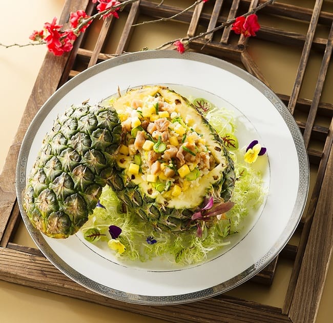 「香宮」粵菜餐廳何競業主廚也不遑多讓,精心製作了多樣粵式鳳梨美饌,例如:鳳梨咕嚕蝦球、鳳梨汁酥炸雞脯和菠蘿炒生骨等。何主廚特別推薦原盅菠蘿雞粒炒飯,這道經典料理是將鳳梨挖空,將果肉及台東放山雞腿肉切丁、與米飯一同大火快炒,主廚特別選用了屢屢獲選經典好米的台灣香米下去拌炒,吃得出粒粒分明且鑊氣十足,嚐得到彈牙的雞肉帶著淡淡鳳梨甜香,讓人忍不住一口接一口,享受這幸福滋味。每道單點從788元到888元不等。
