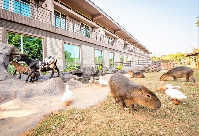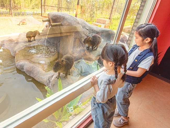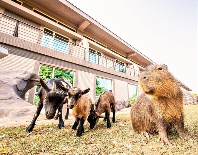 水豚是地球現存最大的齧齒類動物,體型圓滾滾,吃飯、泡澡、發呆都自帶萌感,福豚家族來到關西六福莊後,居住在全新規劃的馬達加斯加島場域內,除原有的羊駝、狐猴、狐獴大明星外,還有跟侏儒山羊、紅腿陸龜等動物好友共同嬉戲,也會與科爾鴨一起在大水池內享受泡湯樂趣,多達7個不同的物種在島內共同生活,為全台唯一水豚與動物好朋友們的多物種友善共棲環境。
