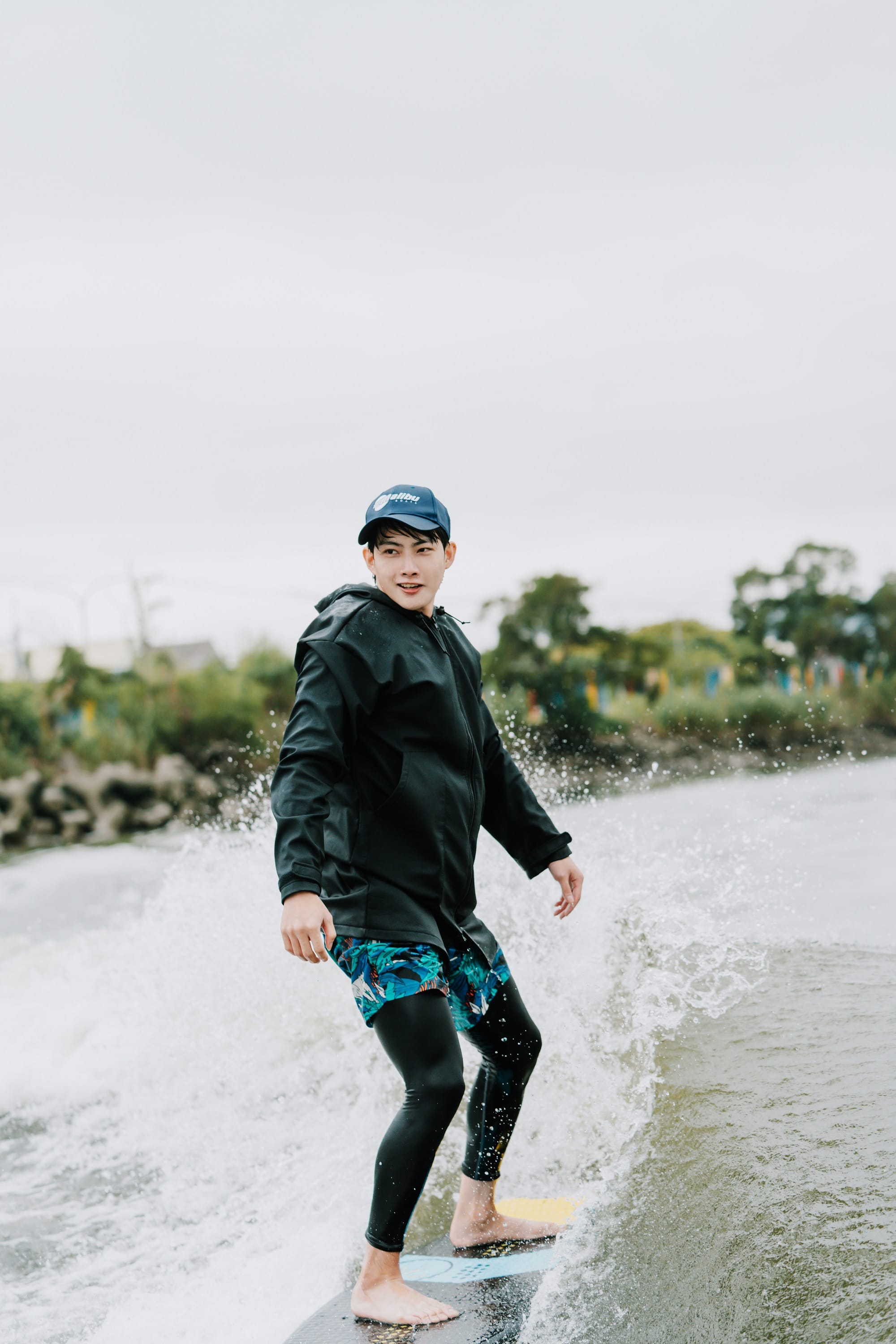 滿滿的運動細胞也展現在這次拍攝的快艇衝浪,短短兩天就學會站在板上,展現帥氣英姿。