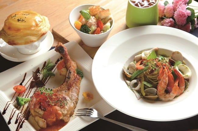 除了住的空間別具新意,「虎尾春秋」亦提供各類美食迎賓。一樓的SunnyQ陽光公主與國內插畫家Smart合作,滿滿的童趣插畫,宛如進入童話世界,入住即可享用免費早餐,其中,以華麗的雙層芝士雞肉堡最受歡迎;中餐與晚餐供應排餐、義大利麵、燉飯、披薩等各國美食,尤其推薦戰斧豬排,特選雲林良作工場的豬肉,醃製入味一天以上,是肉食者的最愛。此外,頂樓的沐砌天台酒吧是大人的專屬時間,半露天的空間在大小圓吊燈的點綴下,十分浪漫,來杯啤酒或調酒,欣賞小鎮寧靜的夜空,別有一番滋味。