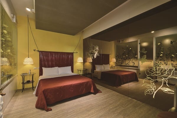 規劃共有4間客房,3間為雙人房,分別以甜蜜綠、幸福黃、害羞的橘構築「愛戀幸福」,曖昧紫、純粹白、神祕黑打造的「深情密碼」,以異色木材質拼貼的主牆面舖陳「浪漫滿屋」的層次美。1間為4人房,以熱情紅、貴氣金、嬌媚的桃紅,交織成感性優雅的「仲夏夜之夢」,此外,每間客房皆設置雙人白色或紅色的心型浴缸,浪漫指數更是破表。