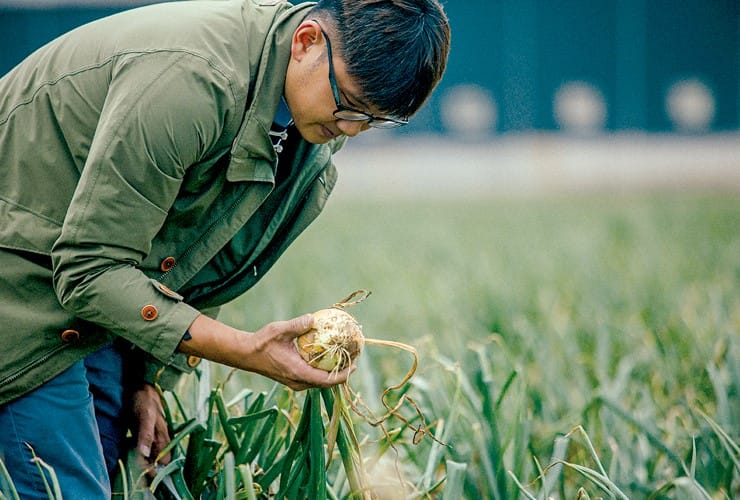 而施肥時間上整個生長期共三次追肥,第1次追肥在定植後10~15天施用「寶效101號」40公斤/每分地,第2次追肥在第1次追肥後20天進行施用「金旺特43號」50公斤/每分地,第3次追肥在第2次追肥後20天再次施用「金旺特43號」50公斤/每分地搭配「即溶肥6號」10公斤/每分地。後續就可以等待蔥頭肥大,直到變成我們印象中的洋蔥模樣後就可以準備採收了!