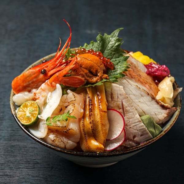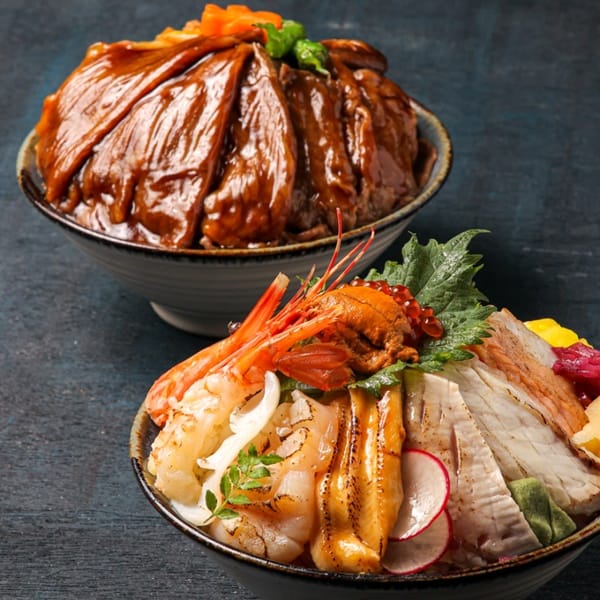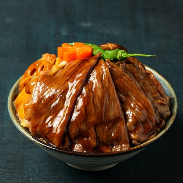 「和風海陸盛合」中代表陸地的美味是「A5和牛壽喜燒蓋飯」,主廚選用日本進口、A5等級的和牛牛臀肉,精切成約0.2公分厚的薄片,料理時會先以和牛的牛油在熱鍋中炒香洋蔥與牛蒡,倒入以日本清酒、醬油、味醂與砂糖等慢熬後,再放入昆布浸泡三天製成的壽喜燒醬汁,接著依序加入大白菜、香菇、蓮藕、紅 白蘿蔔與豆腐,最後輕涮入日本 A5 和牛臀肉片,至牛肉呈現粉紅色澤後取出,鋪於鬆軟香Q的白飯上而成,入口肉質軟嫩,滿是油花的肉質創造出滋味細膩醇厚的鹹香美味。