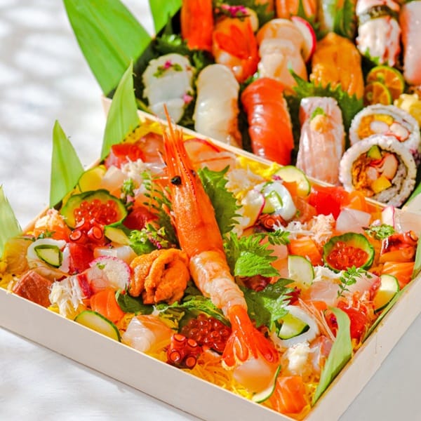 翌日中午的美食亮點則是每日從台東成功漁港直送到店的「極特上雙饗盛合」,點用原價格為2,760元,推出至今已銷售超過四千份,由館內最負盛名的栢麗廳自助餐廳主廚張明志負責規劃,內容包含以油脂豐腴的鮪魚、鮭魚和旗魚,口感爽Q的章魚與花枝,鮮甜的牡丹蝦、紅魽等漁獲所製成的16貫「特上握壽司盛合」以及一盒滿載鮪魚、鯛魚、紅魽、鮭魚、牡丹蝦等精切漁獲,再搭配新鮮海膽與松葉蟹肉提升豪華質感,最後綴上鮭魚卵、茗荷、蛋絲、櫻桃蘿蔔、紫蘇花等而成「極品散壽司盛合」,新鮮豐美的漁獲透過主廚精湛的刀工及廚藝,成就出一款款宛如珠寶盒般、鮮香甜美的海味珍饈。