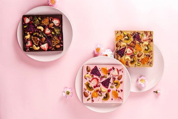 情人節除了花禮,當然也少不了你儂我儂的巧克力。一禮烘焙推出七夕限定夢幻水果巧克力磚,為浪漫情人節添上繽紛色彩,主廚嚴選來自比利時的頂級可可食材,加上各式台灣小農鮮果乾,並且為了維持品質果乾皆由廚房自行烘製,沒有多餘的添加物,象徵戀愛的純粹,一入口巧克力的苦韻象徵愛情之初的苦澀,緊接著柑橘、奇異果、草莓等果乾的天然微酸,帶出最後甘甜的後韻,多層次的風味,充分演繹出戀愛的各種甜蜜滋味。共有五種口味可選擇,有濃苦風味的黑巧克力、也有酸甜口感的草莓巧克力還有香濃牛奶風味的白巧克力,每款售價為520~650元,即日起即可至一禮烘焙門市及六福美饌官網訂購。