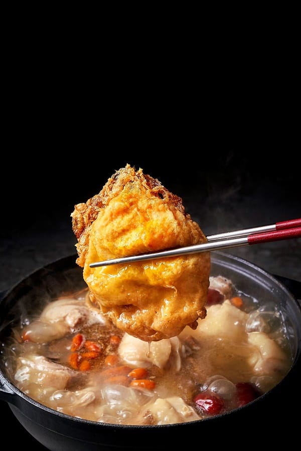 尬鍋除了必吃鍋物,另有吃鍋必配經典熟食可點,「尬個炸蛋」:嚴選優質洗選蛋酥炸,沾附濃郁醬汁具麻香風味,爆漿的黃橙蛋汁拌著白飯或雞肉飯,一吃上癮;還可將炸蛋加雞湯,蛋吸飽湯汁,入口多汁,一蛋多吃,顛覆味蕾。