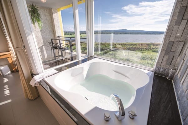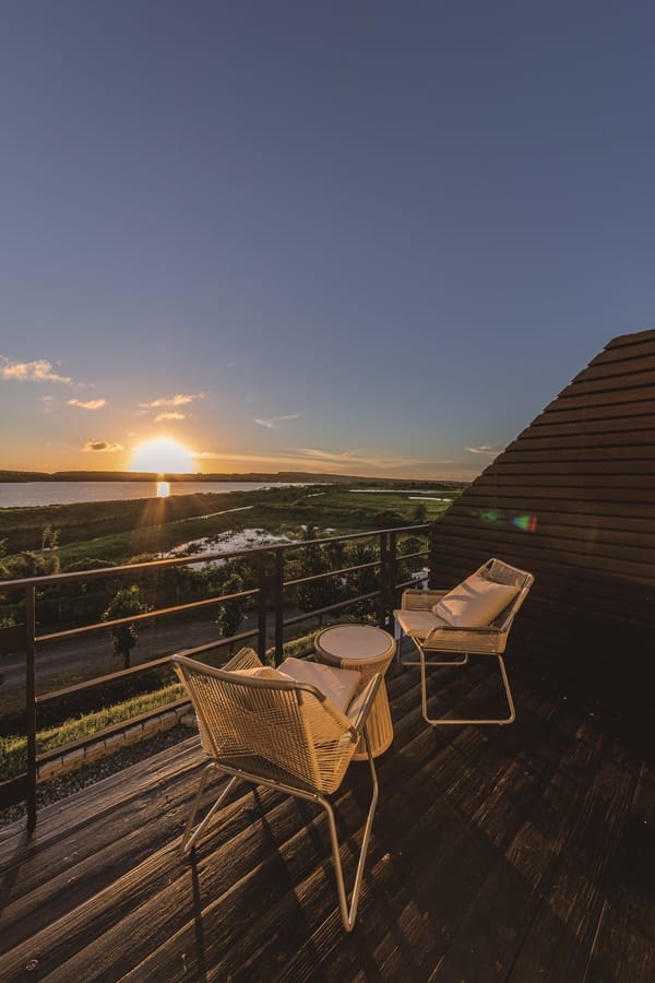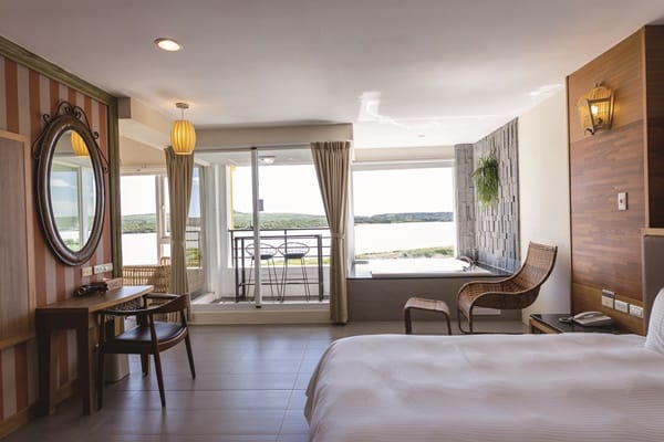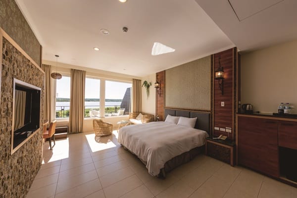 「星光館」共有39間客房,規劃有浪漫湖景雙人房、湖畔四人家庭房、花園四人家庭房以及豪華湖景閣樓家庭房等,每一間客房都是面對龍鑾潭,打開房門,尖叫聲!眼前景觀真是無敵,旅宿主人無私地將休憩空間放大,整體客房設計舒適溫馨雅致,大面落地玻璃窗,可以飽覽潭水風光,部分房型配有浴缸,戶外陽台可以直接走出房門,讓旅客擁有最美湖景,完全徹底紓壓舒放。最棒的是豪華湖景閣樓家庭房,寬敞格局配有一張雙人床、大浴缸、吧檯椅與小客廳,可以一邊舒服的泡澡,一邊享受窗外的藍天綠波,閣樓也有擺設一張雙人床,設有電視與空調,很適合親子家庭度假,各自擁有獨立空間不受干擾。其實待在房裡就足以消磨整天了,看龍鑾潭湖水悠悠,生態濕地自然生態豐富,白鷺鷥遷移、鳥兒成群飛過、蝴蝶翩翩飛舞,聽清脆啾啾鳥聲,到了傍晚5、6點時,夕陽西下,餘暉慢慢渲染呈金、橘、黃色澤,浪漫指數破表。