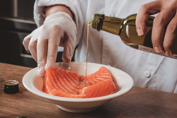 1. 將鮭魚淋上「獵人谷之夢」的初榨橄欖油,加點胡椒粒,兩面抹均勻,醃漬10 分鐘,可以去腥。