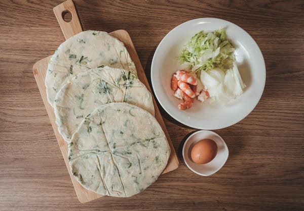 食材:橄蔥餅1 片、明蝦4 隻、高麗菜半顆、洋蔥1 顆、雞蛋1 個。