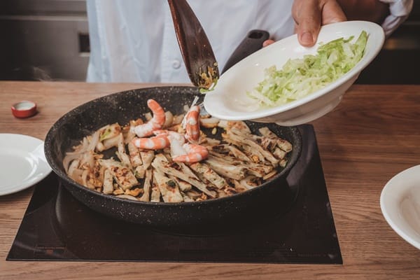 2. 將雞蛋炒的像老蛋一樣,陸續加入明蝦、洋蔥、高麗菜絲、條狀橄蔥餅一起高溫快炒即可。