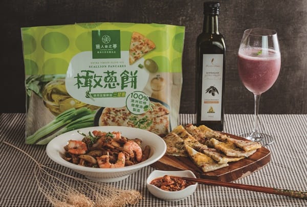 除了優質油品,「獵人谷之夢」亦將橄欖油廣泛應用於各類食品或醬料內,像是很受歡迎的「橄蔥餅」,以100%特級初榨橄欖油製造,手工揉捏桿製、筋性較高的頂級粉心麵皮,搭配嚴選宜蘭鮮甜三星蔥,慢慢咀嚼後可品嚐到麵粉及三星蔥的香甜。香煎「橄蔥餅」就很好吃,林主廚示範還可以發揮更多創意,像是切成條狀加上其它配料類似京餅作法,或是加上紅番茄或番茄醬、起司絲再去烤,就是一道美味的披薩。