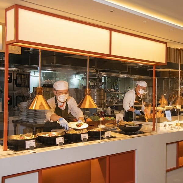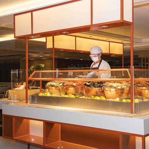 自助餐控久違了!因疫情暫停營業一百多天的遠東Café自助餐廳終於重啟迎賓!9月3日起將於每週五、六、日恢復正常營運,提供午餐、下午茶、晚餐以及晚晚餐。為展現防疫新風貌的遠東Café,十二大主題餐檯皆加裝透明防疫隔板,每個餐檯都由一組主廚團隊負責,嚴選優質食材新鮮現做,仍可欣賞到主廚們在開放式廚房展演廚藝,不減自助餐用餐食趣。同時並規劃每區的取餐防疫動線,饕客還是能像平常一樣戴上口罩至各餐檯自由取餐,由廚師們協助盛盤,以減少接觸公用取餐餐具,進入餐廳需實聯制、測量體溫與消毒雙手,每桌皆提供酒精消毒液、拋棄式手套以及防疫隔板,並保持桌與桌間的社交距離,讓饕客安心享美食。