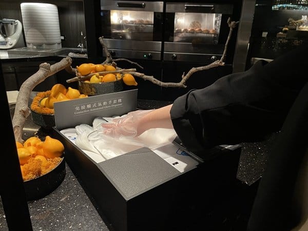 柏麗廳重啟營運的第一項要務就是做好萬全的衛生防疫工作、確保消費者食的安全,除了政府要求的定時消毒清潔、餐檯加蓋、隔板、梅花座、實聯制等措施之外,柏麗廳更是創五星級酒店餐廳之先例,於每一個出風口加裝擁有滅菌效果的紫外線(UVC)–BioLED 365 Care光照設備,確保消費者呼吸的空氣無菌清淨。同時,柏麗廳也自日本進口免接觸式氣動手套機,透過手部感應即可出風為手套充氣,讓消費者無須接觸就可以戴上手套取餐,確保衛生無虞。