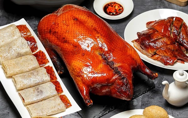 「買6000送6000 餐飲全額回饋」進化版中新增的晶華軒「招牌片皮鴨三吃」,是由擁有超過三十年粵菜經驗的中餐廚藝總監鄔海明監製,嚴選來自於宜蘭、體型大小適中的北鴨為菜單主角,北鴨自幼即採流水式豢養,飲用甘甜溪水,食用天然穀物,得天獨厚的飼育環境造就出口感細嫩,油脂豐富的高檔肉質。主廚遵循廣式掛爐古法,將洗淨後的鴨子填入八角、丁香、月桂葉等辛香料,以熱水汆燙後均勻塗抹糖皮醬汁,經懸掛自然風乾,再以炭火烘烤至鴨皮呈現紅潤酥脆的誘人光澤即可,成品皮潤肉甜,毫無騷味及土味。