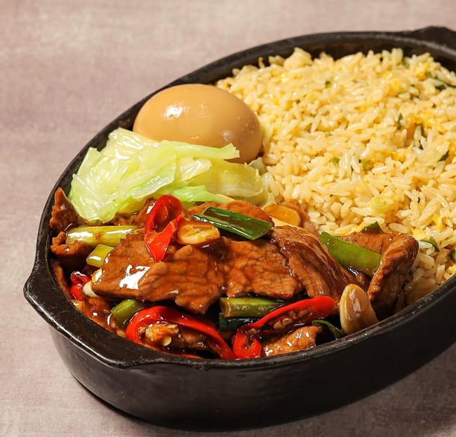 曾經創下一天銷售3,500份的「超人氣熱銷燴炒飯」系列也有多種選項,主廚設計的餐盒內容底層是將蛋花、蔥末與米飯拌炒成鍋香四溢的炒飯,並加入健康滿分的蔬菜和溏心蛋,上層則是川味麻婆蝦球、滬式紅燒牛腩、人氣蔥爆牛肉、蟹粉海鮮豆腐、剝皮辣椒雞、塔香三杯中卷與沙茶梅花豬這7款鑊香十足的熱炒,食用時不僅能以菜配飯、還可將擁有醬料湯汁的菜餚豪邁地淋在炒飯上享用,素食者亦有黑椒猴頭菇燴飯可供選擇。以上每款220元起。
