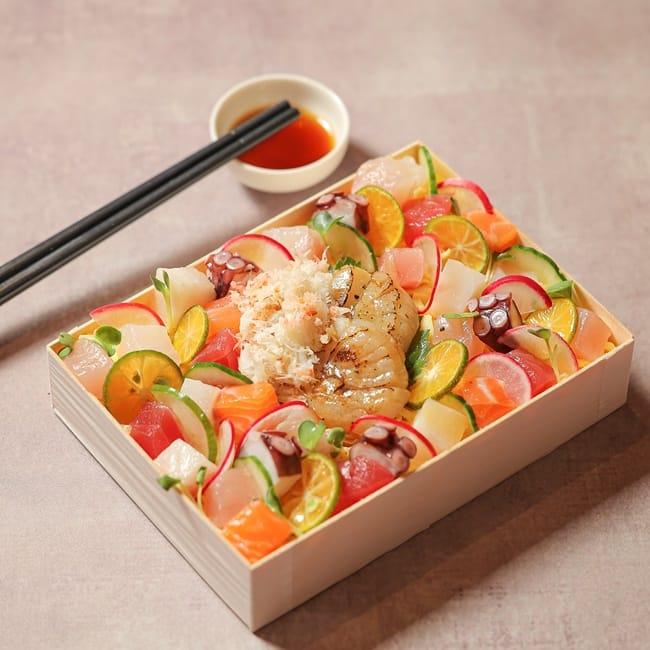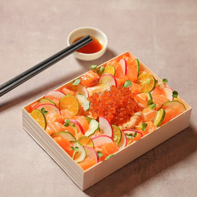 「晶華美食到你家」五星獨饗專區的品項分為中式燴炒、日式丼飯、以及鮮食散壽司三大類,全新推出的「鮮食散壽司」系列提供北海道干貝散壽司以及大西洋鮭魚散壽司兩款美味,前者是以北海道進口的生食干貝搭配鳥取松葉蟹以及新鮮鮪魚、鯛魚、旗魚等多款漁獲而成,大西洋鮭魚散壽司則是匯集鮭魚卵、炙燒鮭魚以及鮭魚生魚片,讓喜愛鮭魚的饕客們一次可品嘗到三種不同的滋味。