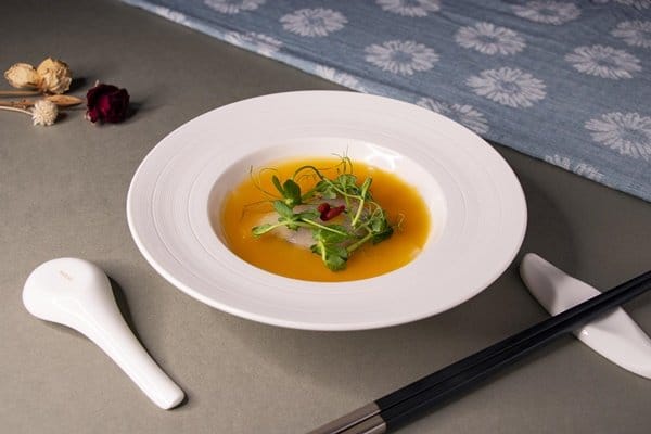 而中餐廳必備的湯品,主廚特別推薦「冬瓜時蔬香米羹」,湯盤中放入香菇、山藥、娃娃菜,再鋪上形同碧玉般透亮的冬瓜片,淋入南瓜、地瓜、紅蘿蔔熬煮的湯底,色澤溫潤、味道鮮美。