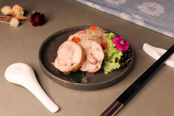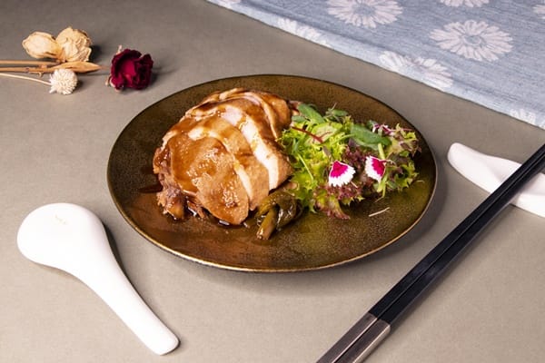 適逢時序入秋,主廚王嘉傑以「雅集」的方式呈現濃淡適宜的佳餚,不僅呼應季節予人的感受,也是富含典雅韻味的餐廳空間欲傳達給賓客的概念。精緻餐前小點「冰鎮愛玉玫瑰露醉雞」,用巴西蘑菇湯清蒸的仿土雞腿肉,浸泡於藥膳酒中醃漬,另將雞湯精華凝結成果凍狀、灑上玫瑰露,帶出微醺浪漫的視覺和風味;「新杭式燻魚佐黃金泡菜」使用上海菜常見的冰糖加醬油調味之醬汁,包裹住經蔥、薑、酒醃過的鱸魚,佐以豆腐乳醃漬的台灣泡菜,滋味兼具鹹甜香;「滬式京蔥冰糖醬鴨」以老滷汁與宜蘭蔥烹調的精華滷製鴨肉,呈現烏亮色澤、散發蔥香,相當適合作為開胃冷盤。